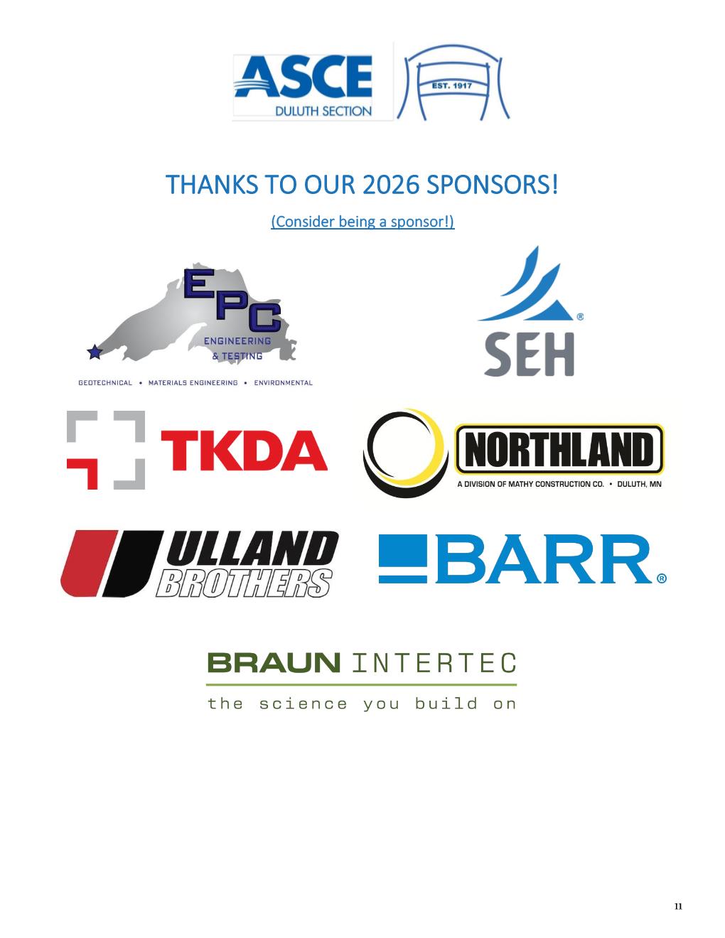To start, I look forward to seeing you all on January 20th at Duluth LHB Office for our monthly luncheon. MnDOT and LHB will be presenting on the London Road project. The cost for attendance is $ 25.00 if you RSVP before January 16 (by 5 pm) and $30.00 at the door and students are free. So please RSVP when you see the invitation if you plan on attending. We are currently planning for the toothpick bridge competition that will tentatively be hosted on April 16. The event will be held at UMD and is for local high school students. This will be our second time hosting the event after a couple years off and we are inviting more schools so we will have a morning and afternoon session. We are in need of judges for this event, so please let us know if you would be interested in helping out.